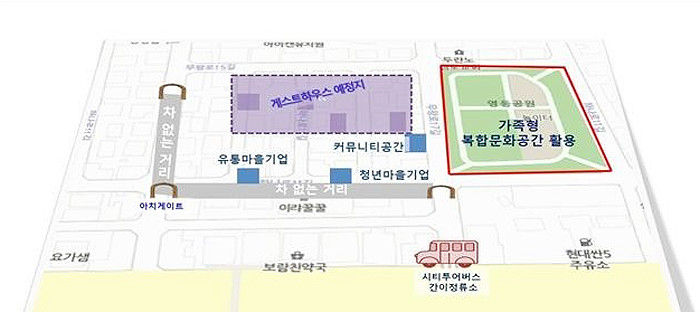 30일 익산시에 따르면 영등동 대상 지역에 차 없는 거리, 조형물 설치, 게스트하우스 리모델링, 젊은 청년상인 중심 골목상가 등이 조성(개념도 참조) 된다.