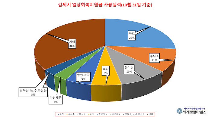 [세계로컬타임즈 조주연 기자] 전북 김제시가 모든 시민에게 100만 원의 일상회복지원금을 지급한 가운데 두달동안 마트에서 가장 많은 금액이 사용된 것으로 집계됐다.