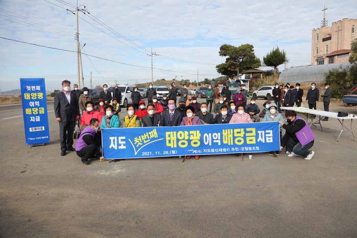'신재생에너지 개발이익 공유 등에 관한 조례'에 따라 지도 100MW 태양광 발전사업의 수익금을 지도 본도 3,512명 전체 주민을 대상으로 1인당 최대 35~11만원을 33개 마을 경로당에서 일제히 지급했다.