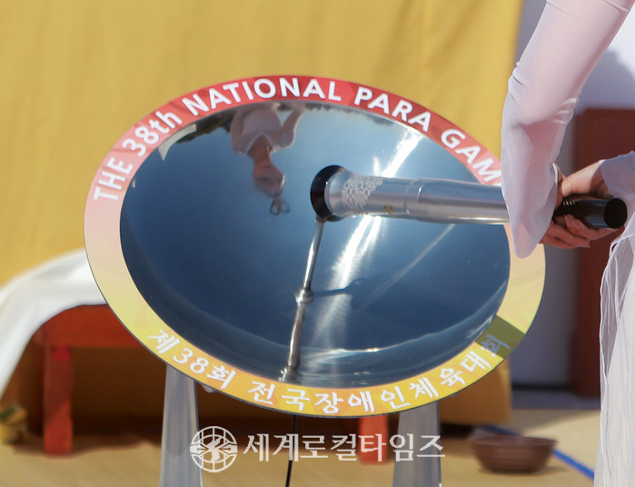 | ▲주선녀가 제38회 전국장애인체육대회 성화를 채화하고 있다.(사진=조주연 기자) |