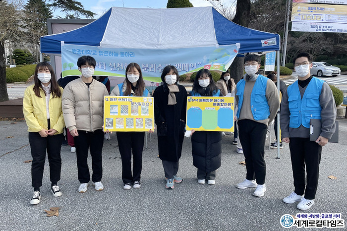 [세계로컬타임즈 조주연 기자] 전북 익산시와 원광대학교 봉사동아리 ‘맑은하늘’이 생활 쓰레기 분리배출 독려 합동 캠페인을 벌였다.