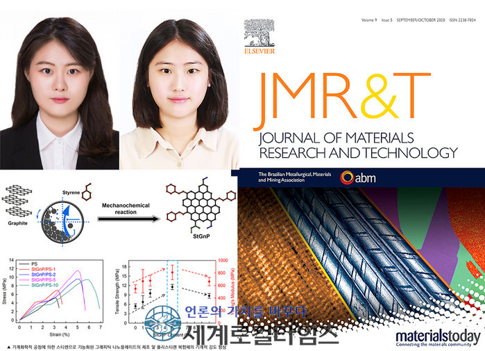| ▲강영아(좌), 김민희(우) 학생, 기계화학적 공정에 의한 스티렌으로 기능화된 그래피틱 나노플레이트의 제조 및 폴리스티렌 복합체의 기계적 강도 향상 (사진=원광대 제공, JMR&T 갈무리) |