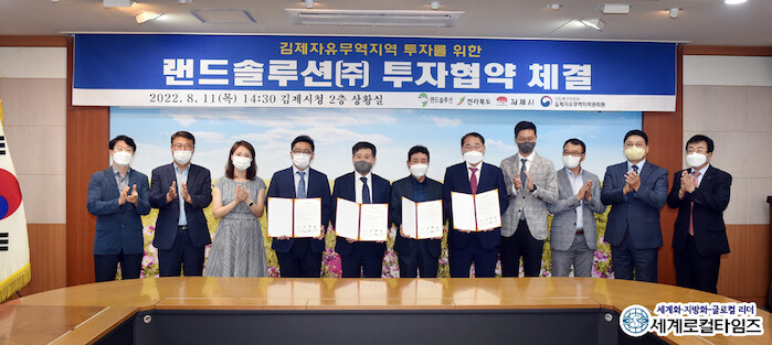 11일 김제시에 따르면 이날 전북도와 김제자유무역지역관리원, 김제시, 랜드솔루션은 김제시청 상황실에서 이같은 내용의 투자협약을 체결했다.