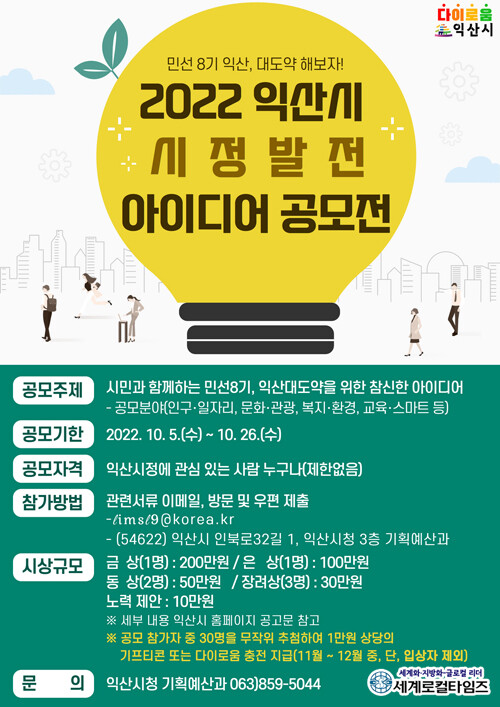 [세계로컬타임즈 조주연 기자] 전북 익산시가 “창의적 정책제안과 시민체감 행정수요에 대응하기 위해 이달 26일까지 2022 시정발전 아이디어 공모전을 개최한다”고 4일 밝혔다.