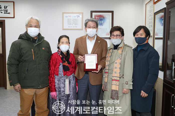 28일 정읍시에 따르면 정읍농악 유지화·김종수, 판소리 김명신, 수건춤 신관철, 전통 술 담그기 송명섭, 악기장 서인석 무형문화재 보유자들은 지난 25일 정읍시청을 방문해 ‘정읍 무형문화재 복합전수교육관 건립’에 고마움을 전 감사패를 직접 전달했다.