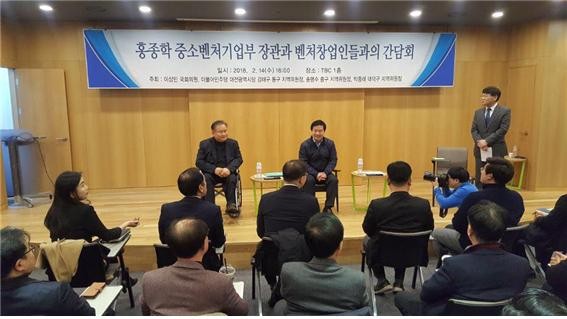 [세계로컬신문 오영균 기자] 더불어민주당 이상민의원(유성·을)은 지난 14일 강래구(민주당 동구 지역위원장), 송행수(민주당 중구 지역위원장), 박종래(민주당 대덕구 지역위원장)와 함께 공동주최로 홍종학벤처기업부장관을 초청해 벤처창업인들과 전통시장 상인들과함께 정책간담회를 가졌다.