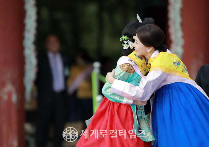 | ▲ 지난해 사선녀 진이 올해 사선녀 진이 된 김고은 양을 안아주고 있다. |