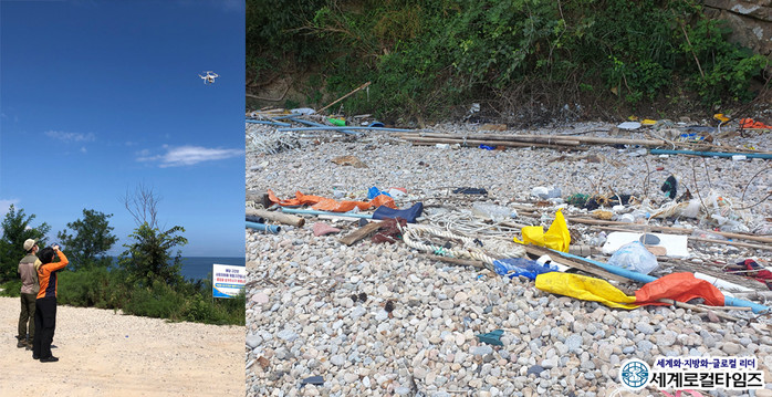 이달 2일부터 변산반도국립공원사무소와 합동으로 부안군 변산면 반월 마을에서 죽막마을 인근 해안가 약 2km를 드론을 이용, 정밀 촬영해 해양 쓰레기 분포 현황을 파악했다.