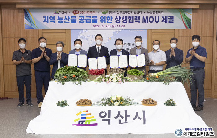 20일 익산시에 따르면 이날 익산시청 상황실에서 식품기업 지역 원재료 공급체계 구축을 위한 익산시, ㈜HS푸드, (재)익산푸드통합지원센터, 농산물출하회와의 다자간 업무협약을 체결하고 협약식을 개최했다.