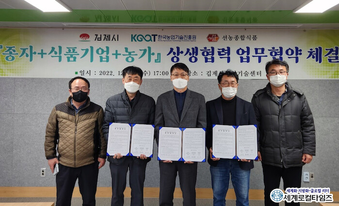 [세계로컬타임즈 조주연 기자] 전북 김제시가 한국농업기술진흥원, ㈜선농종합식품과 상생 프로젝트 추진 협력체제 구축을 위한 업무협약을 체결했다.
