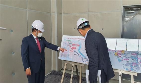 ▲ 한국농어촌공사 강화옹진지사 최재철(오른쪽) 지사장이 신도지구 다목적농촌용수개발사업 등에 대해 배준영(왼쪽) 국회의원 에게 설명을 하고 있다. (사진=한국농어촌공사 제공) |