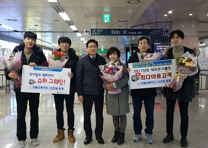 도시철도 공사(사장 김민기)는 지난달 1일부터 31일까지 2017년 도시철도 최다 이용고객을 찾는 이벤트를 벌여 도시철도 이용 우수고객 5명을 최다 이용고객으로 선정하고 12일 시청역에서 경품과 꽃다발이 증정됐다.