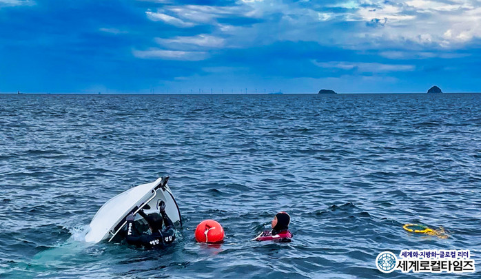 | ▲사진은 전복된 레저보트에서 구조활동을 펼치는 부안해경 ⓒ부안해경 |