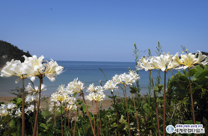 위도해수욕장 주변의 군락지의 흰색 상사화는 꽃대 봉우리가 오는 20일에서 31일이면 최대 만개할 것으로 예상돼 주변 경관을 화려하게 장식 할 것이다.