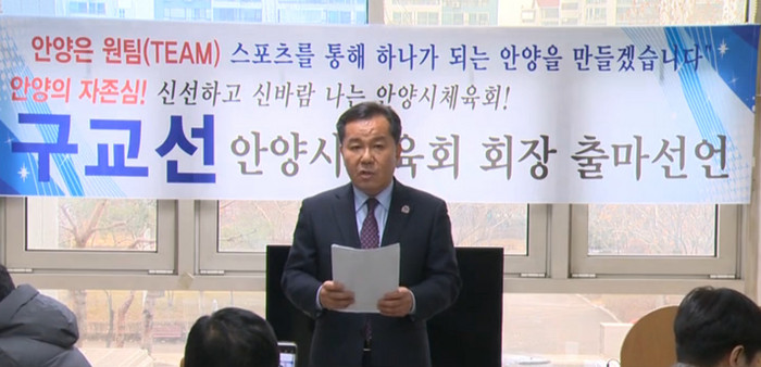 | ▲구교선 후보가 26일 안양시청 기자실에서 안양시체육회 첫 민간 회장 출마선언을 하고 있다. (사진-티브로드방송 화면 갈무리) |