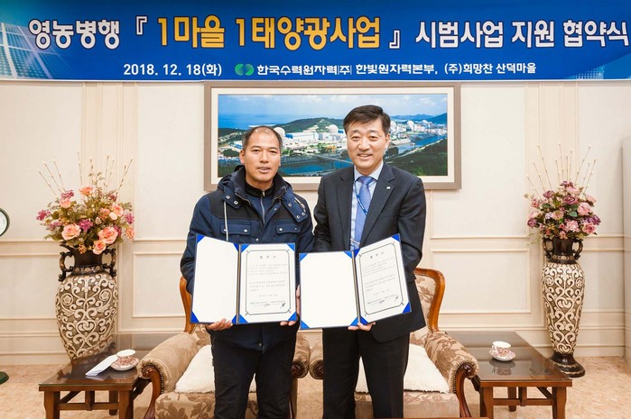 [세계로컬타임즈 이남규 기자] 한국수력원자력과 농업회사법인 ‘희망찬 산덕마을’은 ‘1마을 1태양광 사업’ 시범사업 협약을 체결했다.