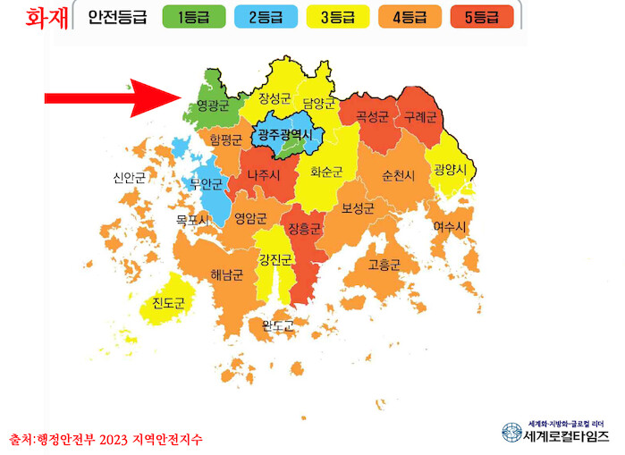 [세계로컬타임즈 이남규 기자] 전남 영광군이 정부의 2023년 지역 안전지수에서 전남지역 기초지자체 중 유일하게 화재분야 1등급을 달성했다. 1등급은 전국 기초지자체 중 상위 10% 그룹에 속한다. 정부는 영광군을 ‘2023년 지역 안전지수 우수지역’으로 선정했다.